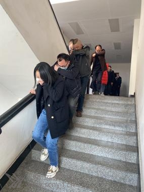 隨后,廖鑫指導(dǎo)大家進(jìn)行高層逃生疏散演練,所有人員一只手捂住口鼻防止?jié)鉄熚肷眢w,另一只手扶住樓梯扶手防止摔倒,沿樓梯右側(cè)彎腰低頭快速從辦公室區(qū)三樓疏散到空曠地帶。