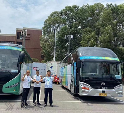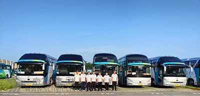 順慶分公司川R82059譚德平(左)和川R79876周永政(右)兩名駕駛員開行“大運(yùn)村——東安湖體育公園主體育場”豪華大巴留影。