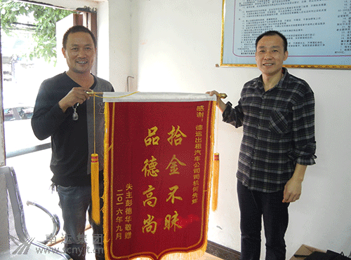 蓬安德運(yùn)出租汽車(chē)公司經(jīng)理張洪濤(右)接過(guò)失主送來(lái)的錦旗