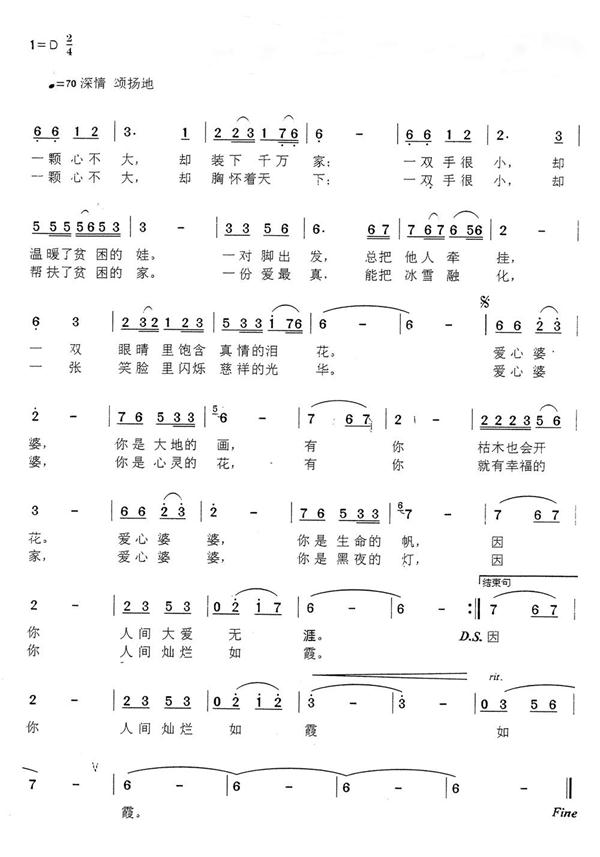 謹(jǐn)以此歌,獻(xiàn)給四川道德模范、四川好人葉千秀老人。葉千秀,女,漢族,南充市南運(yùn)集團(tuán)退休職工。她是一位年過(guò)七旬的老人,身患糖尿病,卻仍然堅(jiān)持幫助他人;她把幫助他人當(dāng)作最大幸福,人們親切地稱她“愛心婆婆”。