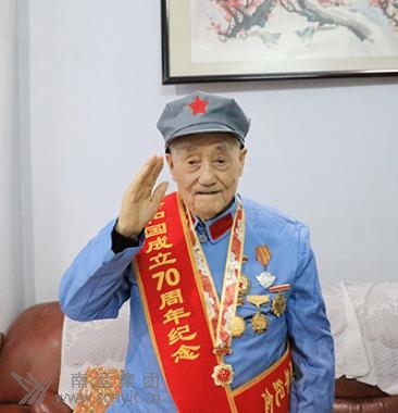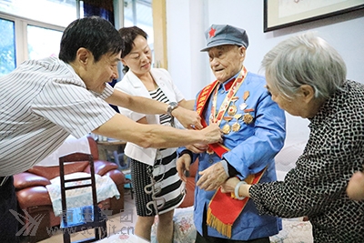 市委組織部副部長、老干部局局長劉彬(左二),南運集團黨委書記、董事長、總經(jīng)理王希平(左一)共同為曹老紅軍佩戴“中共中央 國務院 中央軍委 慶祝中華人民共和國成立70周年”紀念章和綬帶。