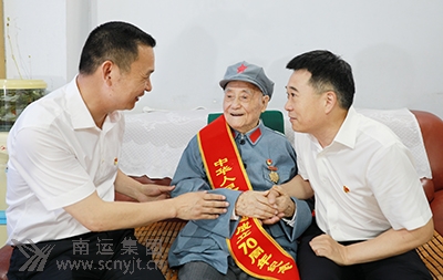 市交通運(yùn)輸局黨委書(shū)記、局長(zhǎng)楊積義(右一)率局黨委委員,副局長(zhǎng)徐小斌(左二)一行在集團(tuán)公司黨委書(shū)記、董事長(zhǎng)、總經(jīng)理王希平(左一)陪同下,看望慰問(wèn)南運(yùn)集團(tuán)老紅軍曹守成。