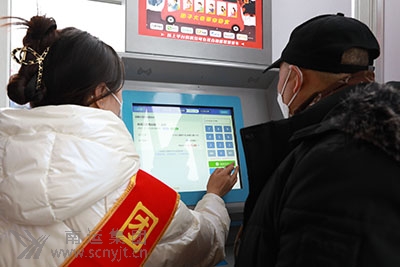 志愿者引導(dǎo)七十歲大爺在自動(dòng)售(取)票機(jī)上購票