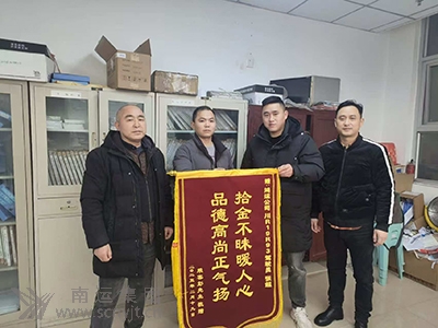 經(jīng)公司多方努力,成功聯(lián)系到失主并將手提包歸還。失主彭先生非常感激,對張超熱情服務(wù)和高尚品德給予高度評價,并于2月19日給張超贈送了一面寫有“拾金不昧暖人心  品德高尚正氣揚(yáng)”的大紅錦旗,以表謝意。