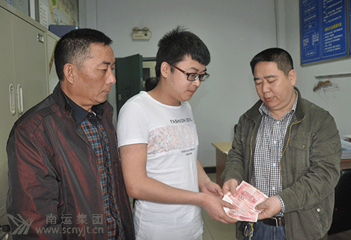 旅客失主沈凡(中)從車站派出所副所長何春林(右)手中接過丟的現(xiàn)金,一再表示感謝。